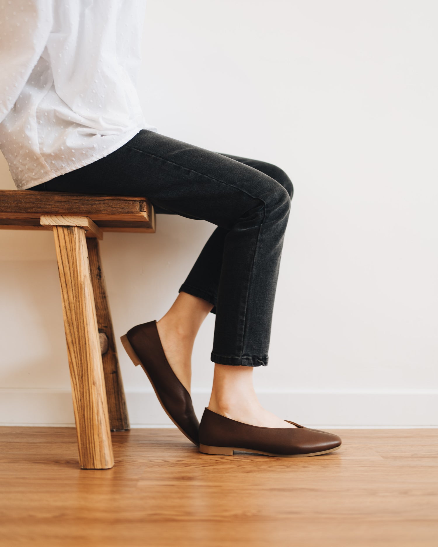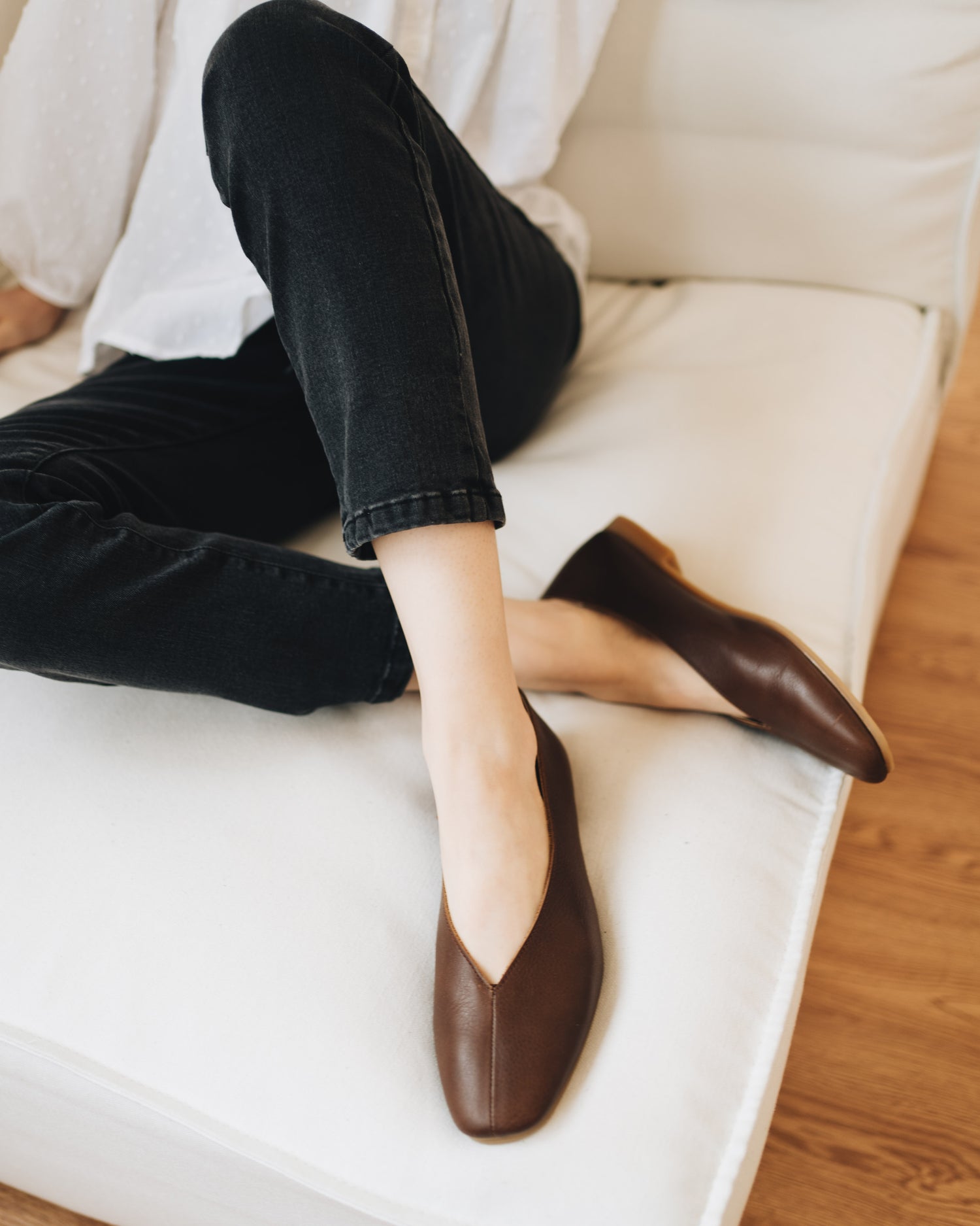 Vカットのトップラインが脚を美しく見せ、ヒール無しでも上品な印象に